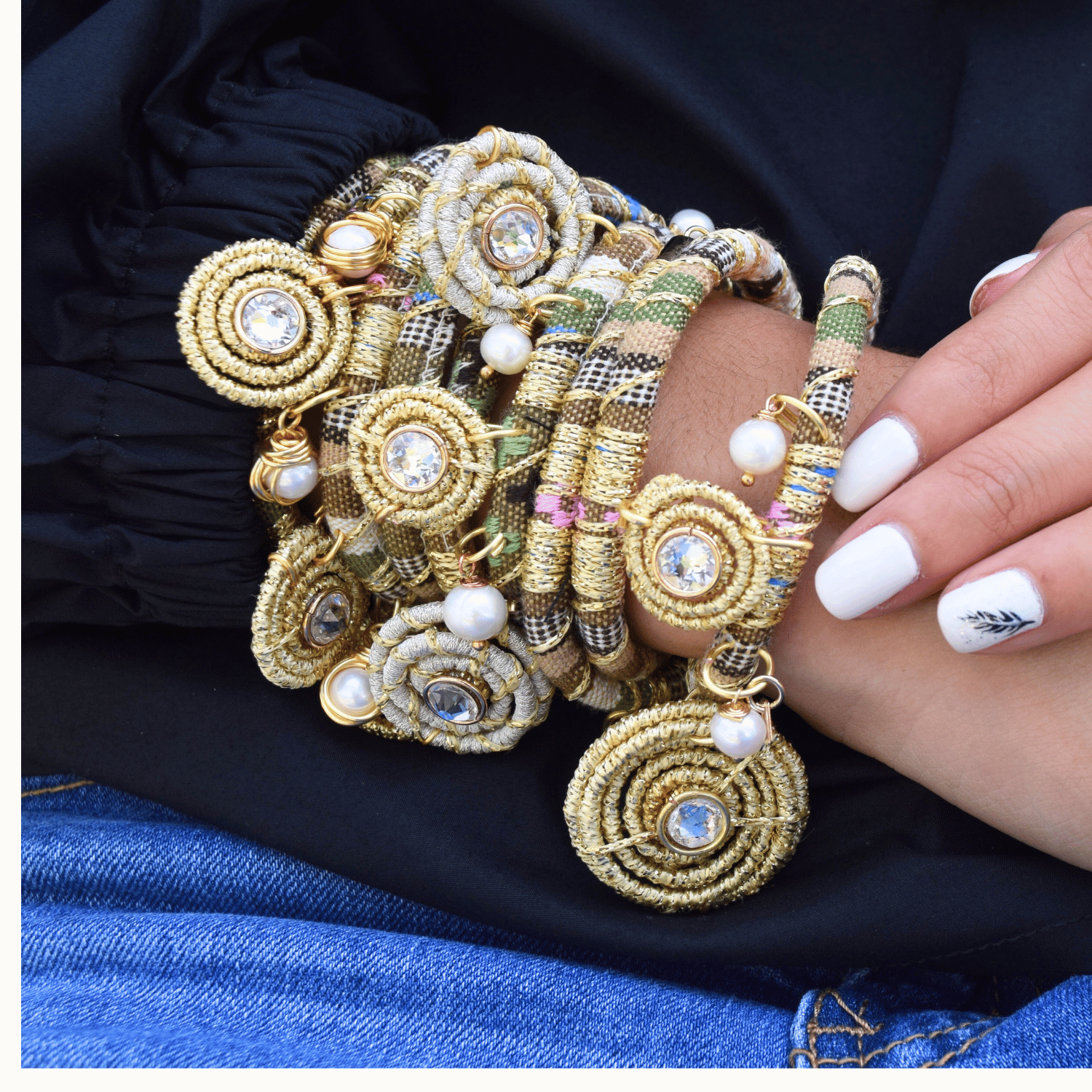 Ethnic cords, delicately intertwined with macramé threads, form the base of this bracelet, original and unique in style. Multiple pearls seem to dance alongside a trio of handcrafted spirals created using an exclusive technique from our workshop, each enhanced by a genuine Swarovski crystal at the center, adding unmatched brilliance. Undoubtedly, this bracelet will draw attention, not only for its beauty but also for the profound meaning that each spiral represents (evolution, awareness, and growth), evoking stories of connection and transformation.