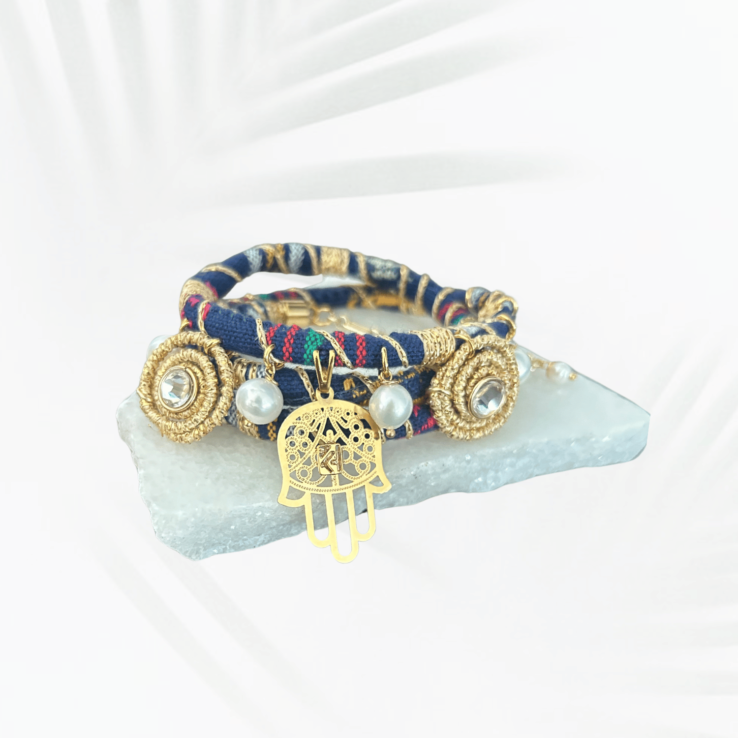 Ethnic cords, delicately intertwined with macramé threads, form the base of this bracelet, original and unique in style. Multiple pearl seem to dance alongside handcrafted spirals created using an exclusive technique from our workshop, each enhanced by a genuine Swarovski crystal at the center, adding unmatched brilliance. The focal point of the bracelet is a gold-plated hamsa. Undoubtedly, this bracelet will draw attention, not only for its beauty but also for the profound meaning that each spiral represents (evolution, awareness, and growth), evoking stories of connection and transformation.