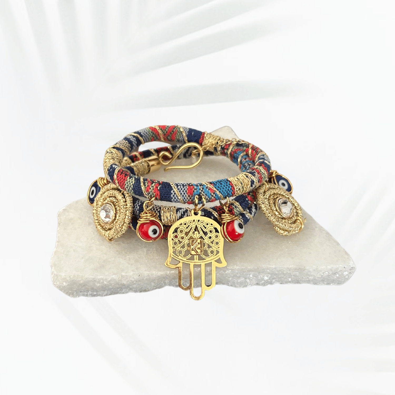 Ethnic cords, delicately intertwined with macramé threads, form the base of this bracelet, original and unique in style. Multiple Turkish eyes seem to dance alongside handcrafted spirals created using an exclusive technique from our workshop, each enhanced by a genuine Swarovski crystal at the center, adding unmatched brilliance. The focal point of the bracelet is a gold-plated hamsa. Undoubtedly, this bracelet will draw attention, not only for its beauty but also for the profound meaning that each spiral represents (evolution, awareness, and growth), evoking stories of connection and transformation.