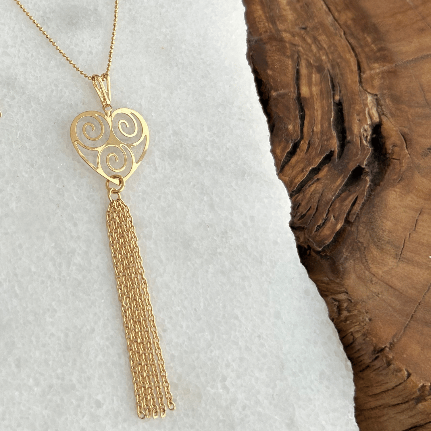 The Harmony Love necklace is a masterpiece that fuses symbolism and sophistication, designed to elevate your style with a touch of daily elegance. Its delicate pendant features a triskelion, symbolizing the harmony between body, mind, and soul, masterfully framed within a heart, intertwined with a harmonious dance of metallic tassels. Meticulously handcrafted, every detail reflects a commitment to excellence, adding a subtle touch of distinction to any outfit.