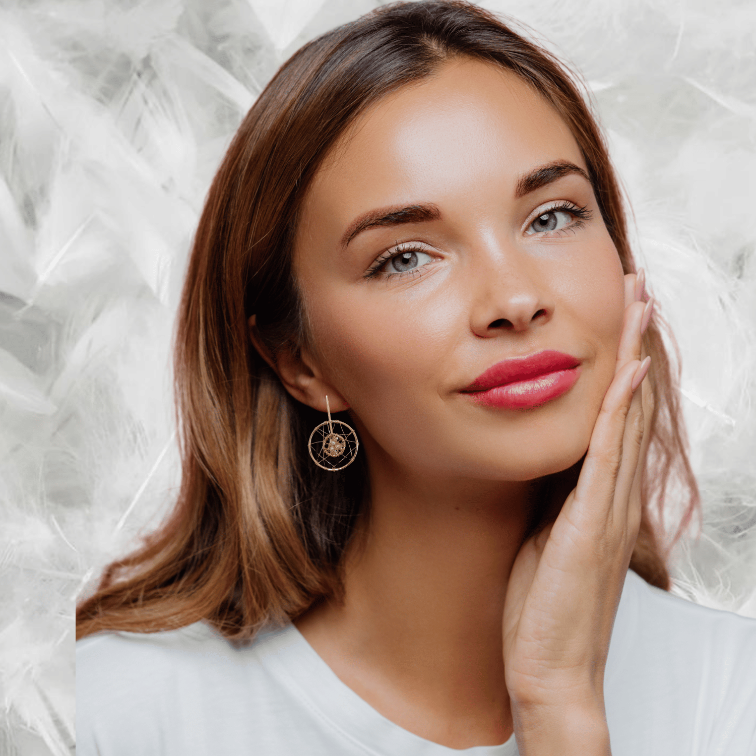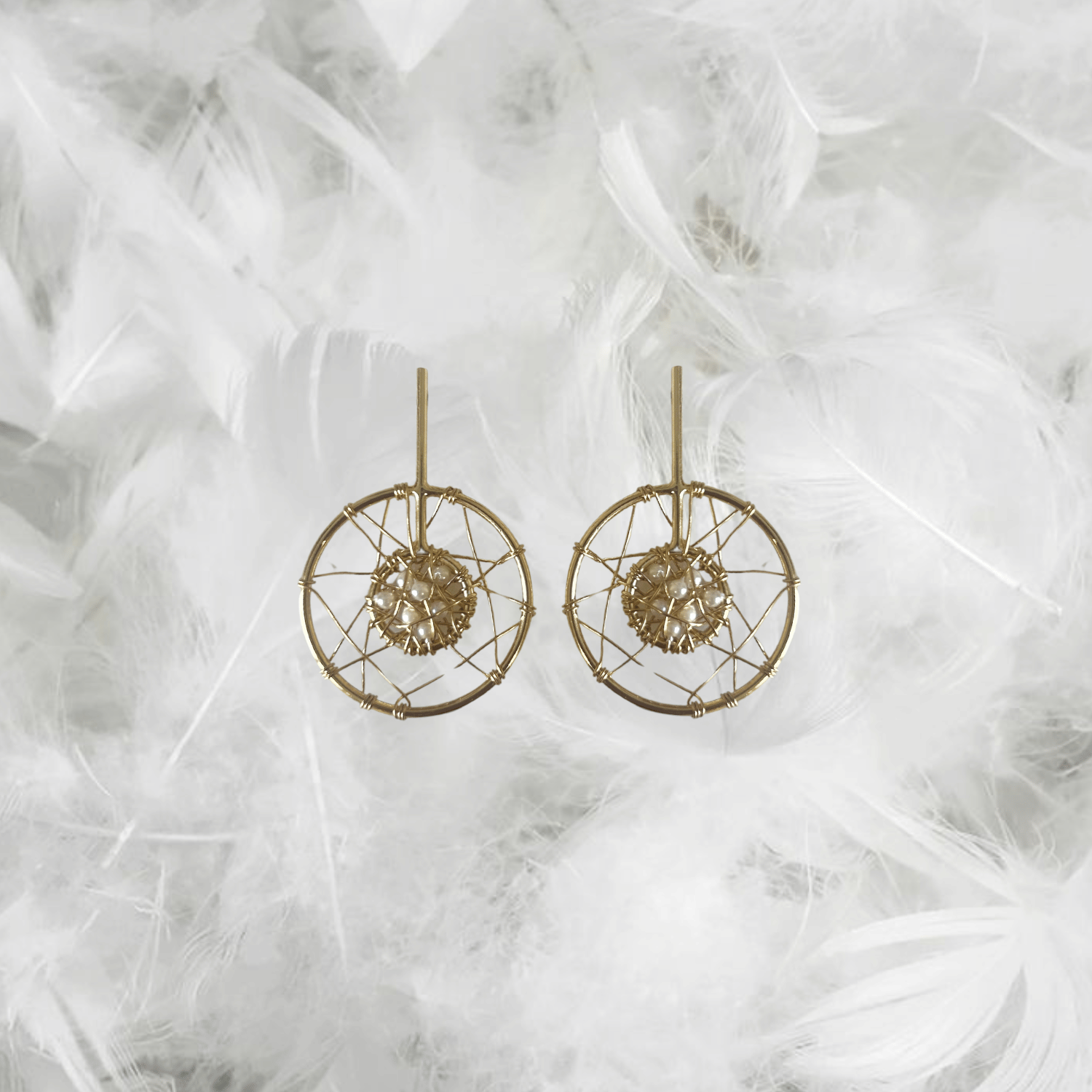 These dreamcatcher earrings feature a bold geometric design, where synthetic mini pearls and gold-plated threads interlace in a harmonious dance to form a delicate network. Inspired by the ancient legend of capturing dreams, these earrings not only embody elegance but also envelop you in an aura of mystique and charm. Versatile and enchanting, they transform any occasion into a moment of ethereal glamour, enhancing your beauty with a touch of timeless magic.