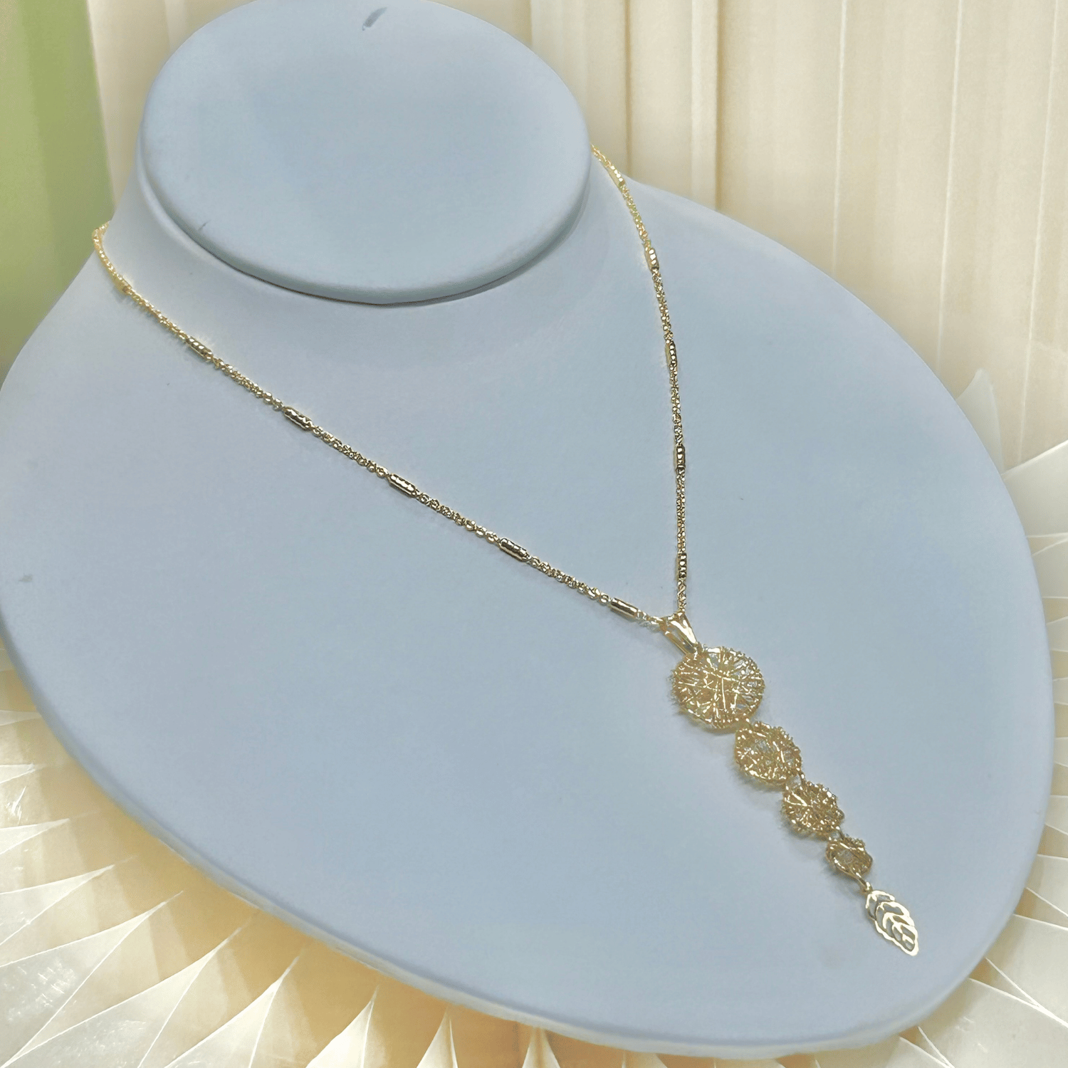 This cascading dreamcatcher necklace evokes a design that is bold, delicate, and sophisticated. Meticulously handcrafted with gold-filled threads, this accessory is perfect for those looking to add a touch of distinction to their casual look, merging meaning and style in a piece that shines with elegance. Ideal for those who appreciate beauty in every element they carry.