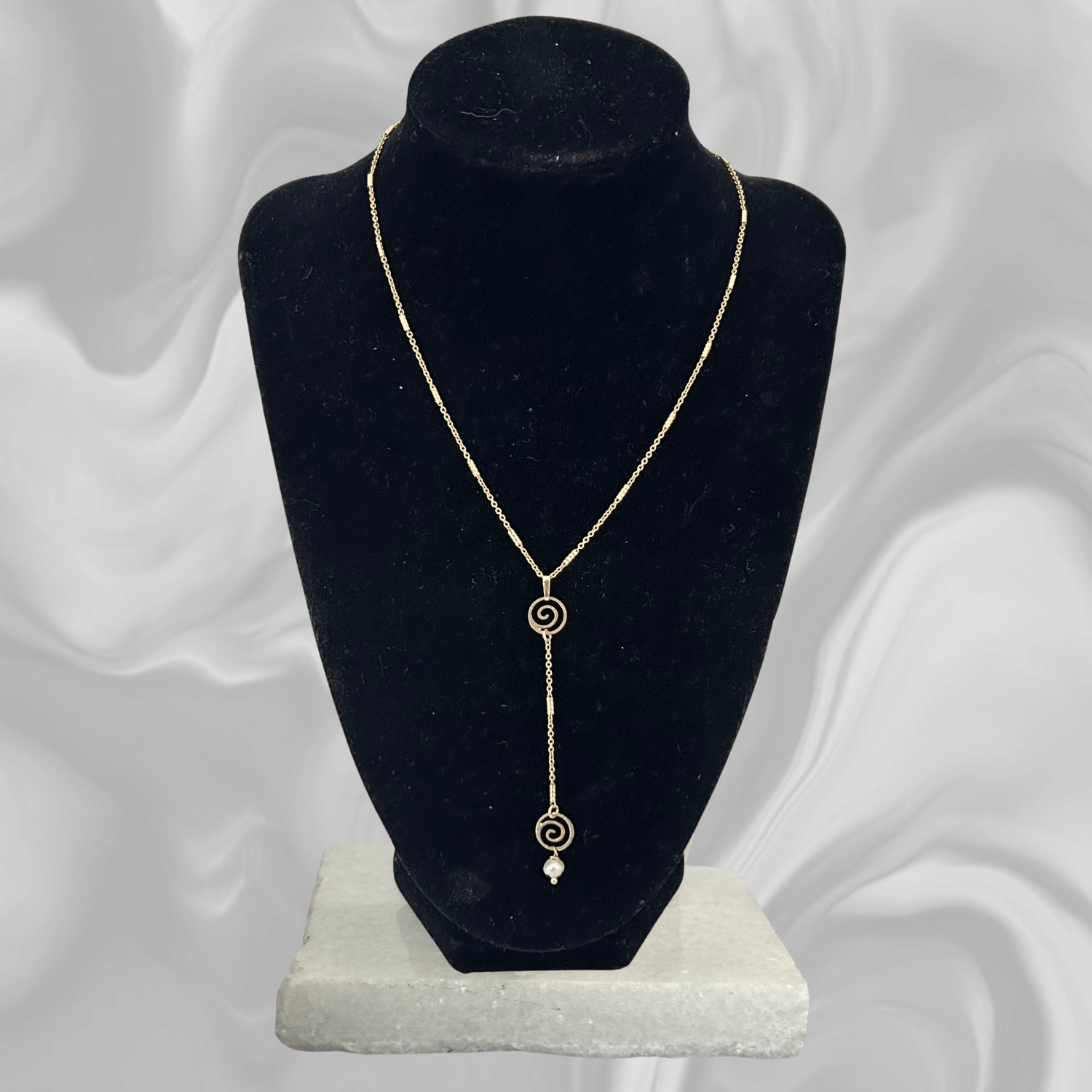 Enhance your look with this exquisite necklace, which adds a subtle and delicate touch. Its Y-shaped design arranges the spirals so that they gently fall over the chest, creating a captivating visual harmony. The pearl at the end of the necklace adds an accent of sophistication and elegance, elevating the piece to an artistic and timeless level. This jewelry not only complements your style but also tells a story of transformation and evolution.